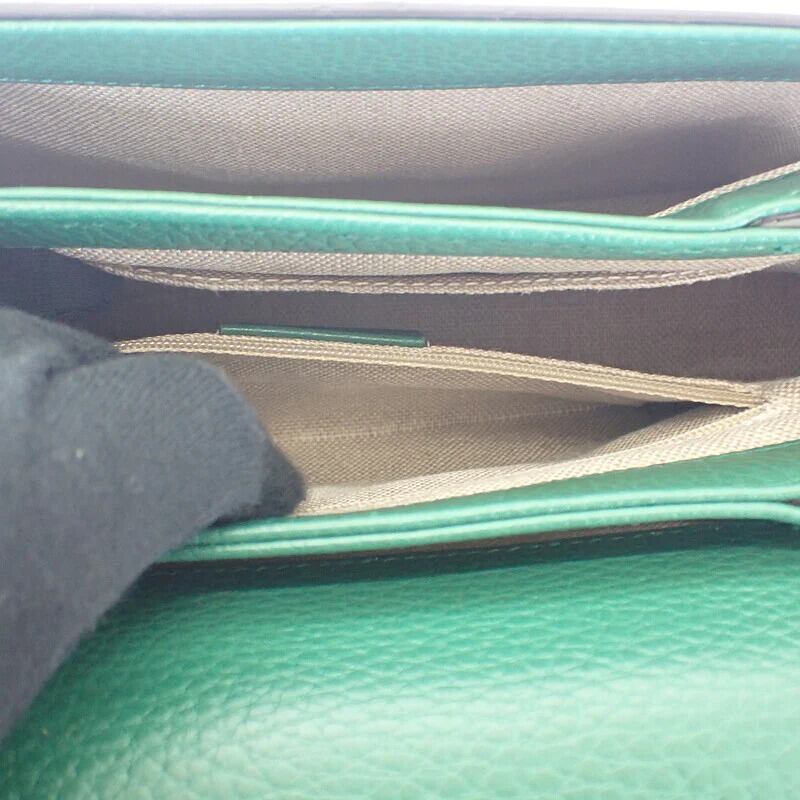 深みのあるグリーンカラーに、ブランドを象徴するゴールドトーンのGロゴが映える上品なデザインです。